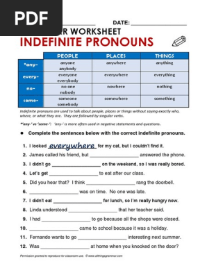 This indefinite pronouns worksheet helps students learn and practice a variety of indefinite pronouns. Exercises indefinite pronouns pdf. Everywhere no one nobody 3.